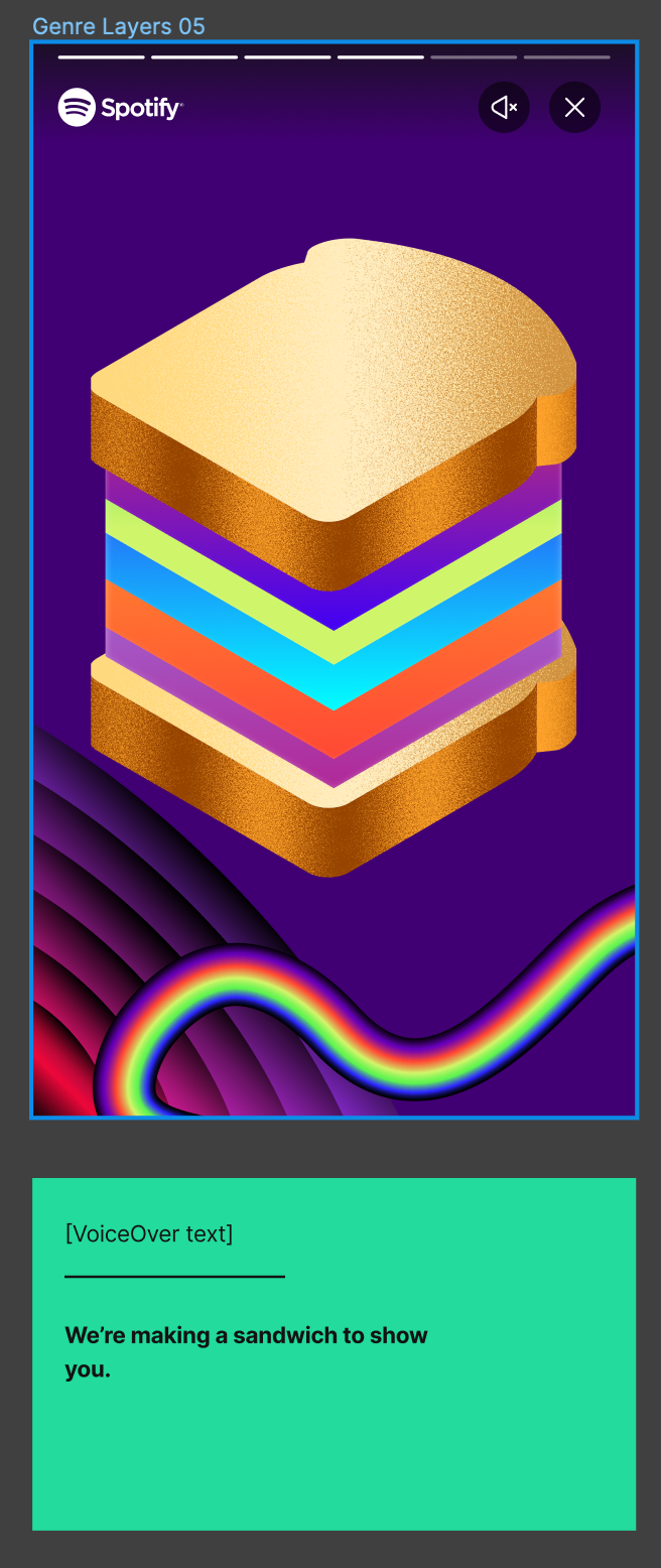 New data stories are always fun and exciting which means they’re also often really challenging. This wasn’t any different with the Sandwich story. Typically, the copy itself on the screen is sufficient for screen reader users to get full context. While in Wrapped much of the imagery serves as decoration rather than conveying relevant information, in this case if you don’t mention that it’s a sandwich, you are not conveying the playfulness of the story, and the user is missing some of the context. To address this, we had a content designer take a look at the copy for screen readers suggesting how we can present these nuances to screen reader users. If you just make the copy on screen accessible by screen reader users, you can see how the user won’t know we are building a sandwich for them (which is a big point of the story!).