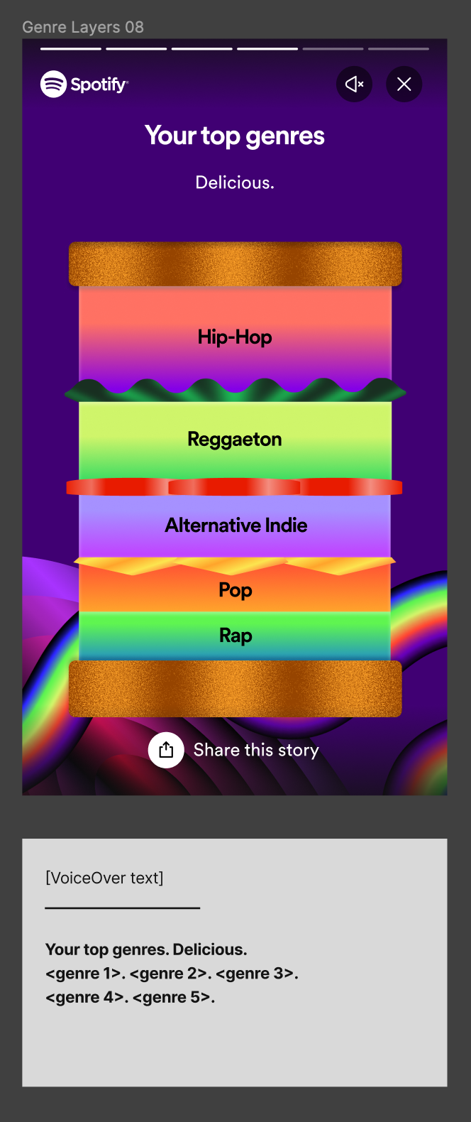 New data stories are always fun and exciting which means they’re also often really challenging. This wasn’t any different with the Sandwich story. Typically, the copy itself on the screen is sufficient for screen reader users to get full context. While in Wrapped much of the imagery serves as decoration rather than conveying relevant information, in this case if you don’t mention that it’s a sandwich, you are not conveying the playfulness of the story, and the user is missing some of the context. To address this, we had a content designer take a look at the copy for screen readers suggesting how we can present these nuances to screen reader users. If you just make the copy on screen accessible by screen reader users, you can see how the user won’t know we are building a sandwich for them (which is a big point of the story!).
